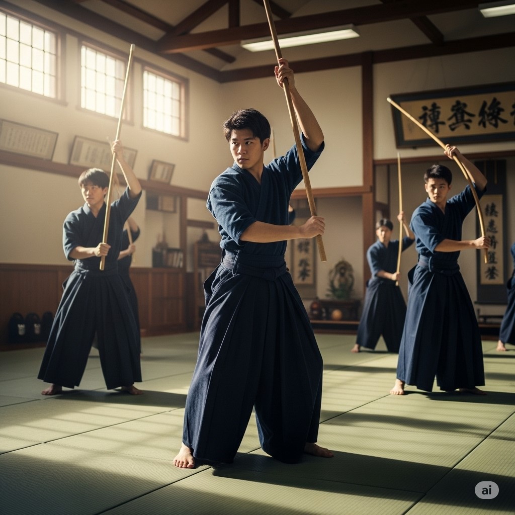 Training sessions begin with warm-ups and basic drills. These include suburi (repeated striking), footwork patterns, and paired exercises. Beginners focus on posture and grip. Advanced students work on fluid transitions and advanced kata.